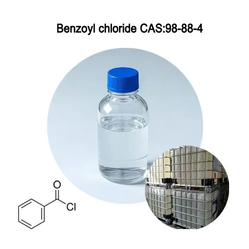 Бензоил хлорид (CAS 98-88-4)е силно реактивен ацил хлорид, който обикновено се използва като междинен продукт в производството на багрила, парфюми, фармацевтични продукти и полимери. Бензоил хлоридът също се използваПластмасови добавки, каучуки други химични междинни продукти.